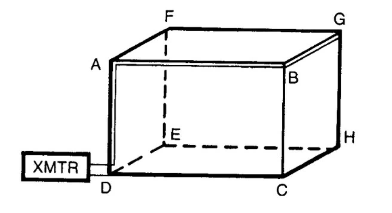 Careful attention must be given to the connection and dress of the Transmitter feed wires. For all Transmitter feed wire configurations used, the Transmitter is connected at diagonally opposite corners of the tested structure. Connecting across diagonal corners will provide the most evenly distributed signal coverage across the structure. By convention, the Transmitter is physically located at and connected to the front wall, which is defined as the most accessible and is typically where the door is located. The second Transmitter feed wire should be dressed along the enclosure’s vertical and horizontal edges to a connection point at the opposite diagonal corner (see Figure 3 for an actual setup). Use approximately 12 inches of No. 12AWG insulated, stranded wire for the short cable and as much as necessary for the long cable. If a bolt or screw head is not available for attaching the feed wires’ ends, drill and tap the nearest frame member. Do not tap through the panel. These feed wires can be installed permanently if desired to facilitate future testing. The polarity of the connections is inconsequential.